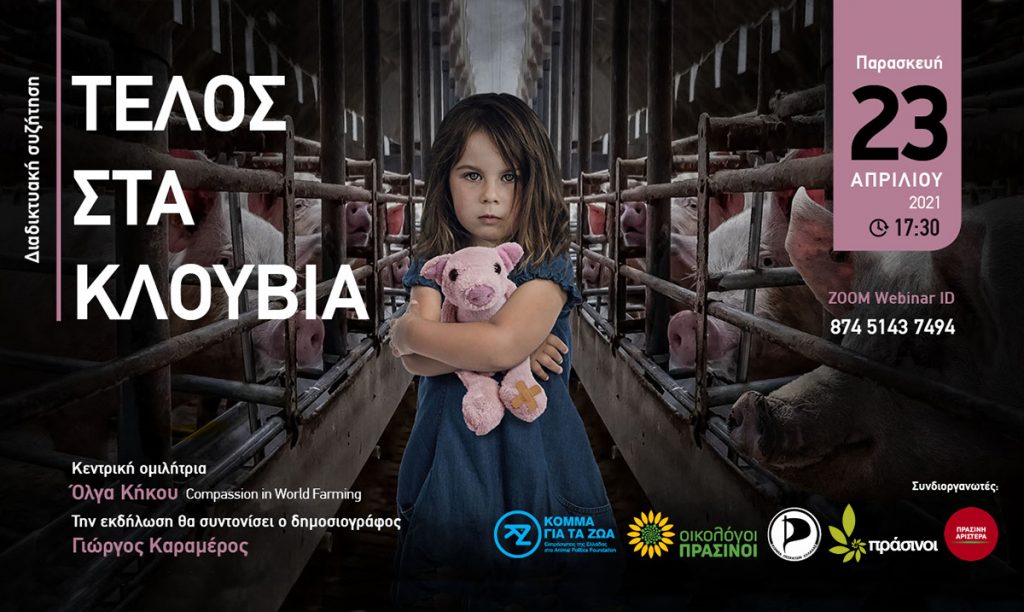 Σας προσκαλούμε στη Διαδικτυακή Συζήτηση που συνδιοργανώνουν το Κόμμα για τα Ζώα, οι Οικολόγοι Πράσινοι, το Κόμμα των Πειρατών, οι Πράσινοι και η Πράσινη Αριστερά, την Παρασκευή 23/4, στις 17:30. Θέμα της εκδήλωσης: “Τέλος στα κλουβιά!”