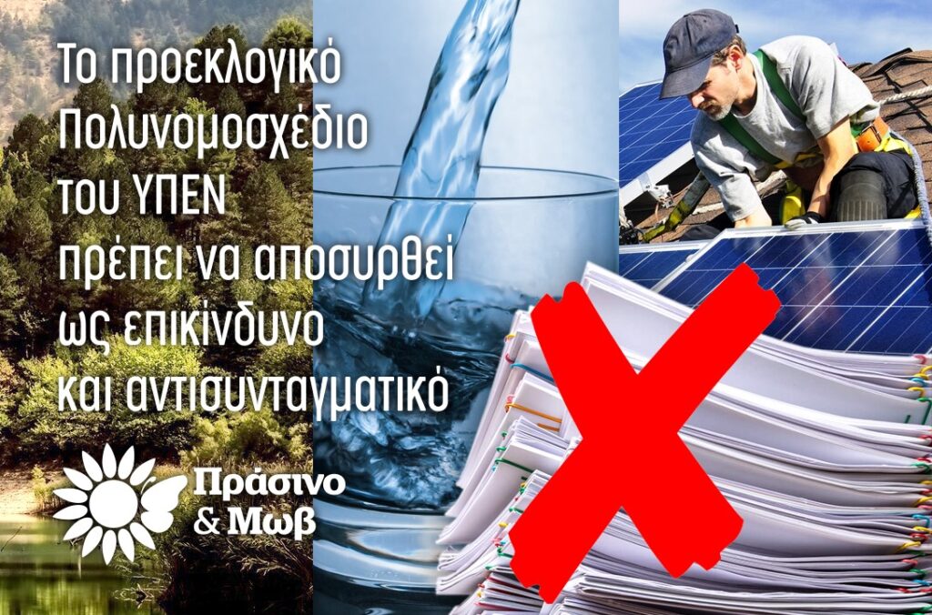 Πρόκειται για ένα πολυνομοσχέδιο εξαιρετικά μεγάλου όγκου στο οποίο συμπυκνώθηκαν τρία νομοσχέδια μετά από προσχηματική, εξαιρετικά σύντομη δηλαδή διαβούλευση, και με άρθρα για τα οποία διαβούλευση δεν έγινε ποτέ. Μια τέτοια κακή νομοθετική διαδικασία, εν μέσω μάλιστα προεκλογικής περιόδου, σε κρίσιμα θέματα της διαχείρισης των υδάτινων πόρων, της ενεργειακής μετάβασης και της προστασίας του περιβάλλοντος και της βιοποικιλότητας δεν μπορεί να γίνει αποδεκτή από τη συμμαχία Πράσινο & Μωβ. Η συμμαχία δεσμεύεται ότι θα εξαντλήσει κάθε μέσο για την άμεση ακύρωση του νομοθετήματος, σε συνεργασία με τις περιβαλλοντικές οργανώσεις και την Ομάδα των Πράσινων στο Ευρωκοινοβούλιο, με βάση τις προβλέψεις του Συντάγματος και της Ευρωπαϊκής Νομοθεσίας.