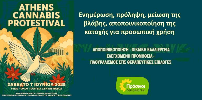 Αποποινικοποίηση της κατοχής για προσωπική χρήση και τη νόμιμη ρύθμιση της χρήσης κάνναβης για ενήλικες ζητούν οι ΠΡΑΣΙΝΟΙ -Οικολογία και στηρίζουν το Αντιαπαγορευτικό Φεστιβάλ (Legalize
