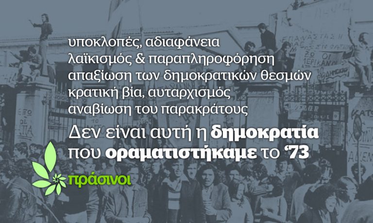 Σε ένα καθεστώς όπου η Δημοκρατία συνεχώς απειλείται και προσβάλλεται, οι Πράσινοι επισημαίνουν ότι το όραμα και οι αγώνες της εξέγερσης του Πολυτεχνείου γίνονται όλο