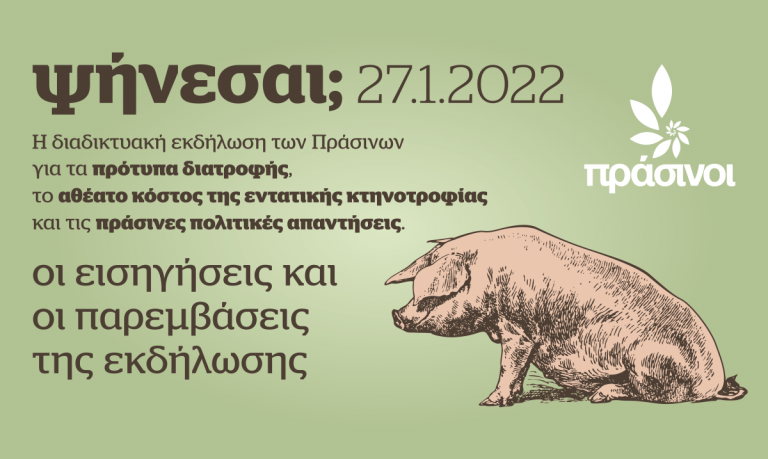 ΨΗΝΕΣΑΙ; Διαδικτυακή εκδήλωση των Πράσινων για τα πρότυπα διατροφής, το αθέατο κόστος της εντατικής κτηνοτροφίας και τις πράσινες πολιτικές απαντήσεις. 27.1.2022. Εισηγήσεις και Παρεμβάσεις
