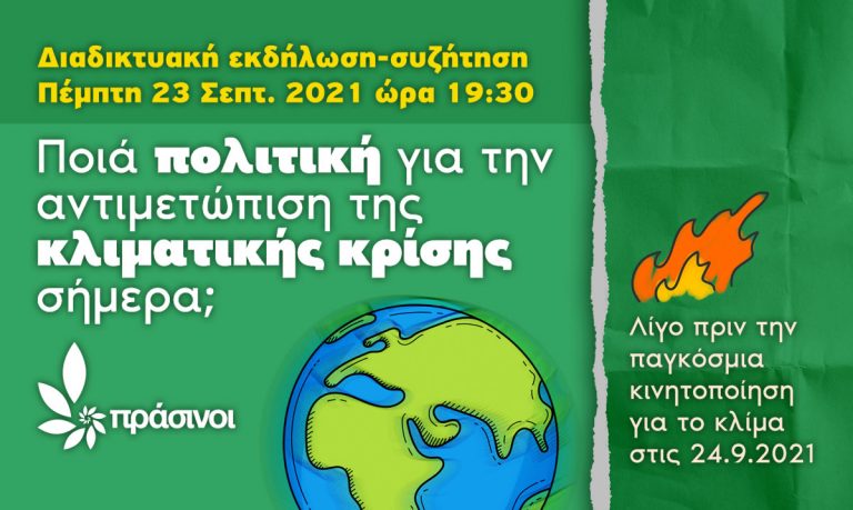 Την παραμονή των κινητοποιήσεων εναντίον της κλιματικής κρίσης το νέο κόμμα των Πράσινων οργανώνει διαδικτυακή εκδήλωση με θέμα: «Ποια πολιτική για την αντιμετώπιση της κλιματικής